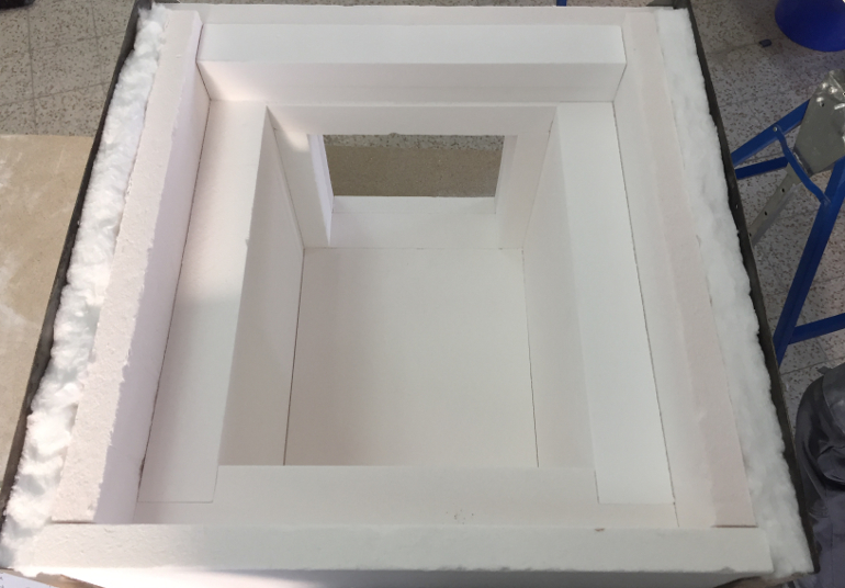 Abbildung 2: ITM-Fibermax® Matte als „elastischer Dämpfer“ zwischen Außenblech und Platten in einem Hochtemperaturlaborofen. Foto: SCHUPP® Ceramics.